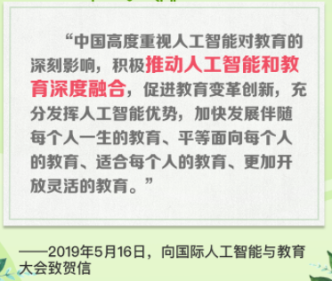 國際人工智能與教育大會(huì )上,習近平主題賀信中提到,要積極推動(dòng)人工智能與教育的深度融合,進(jìn)教育變革創(chuàng )新,要充分發(fā)揮人工智能優(yōu)勢。