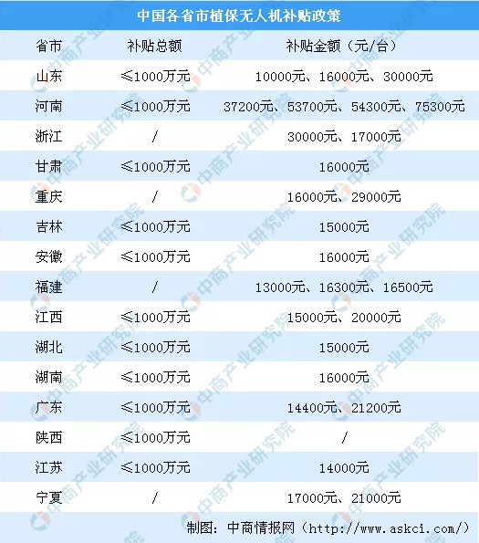 目前,進(jìn)入補貼試點(diǎn)的省市已有浙江、安徽、江西、湖南、廣東、重慶、吉林、福建、甘肅、江蘇等十余個(gè)省市。在整體試點(diǎn)資金安排上,基本為千萬(wàn)元量級。政策支持下植保無(wú)人機市場(chǎng)在全國就進(jìn)入快速發(fā)展期。
