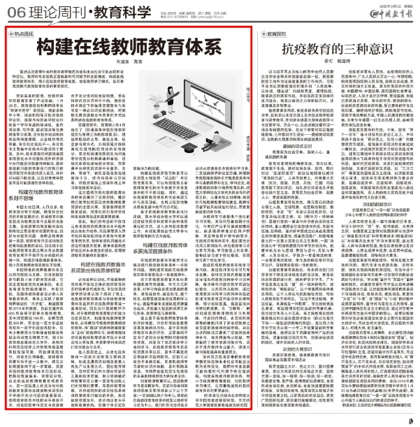 中國教育政策研究院常務(wù)副院長(cháng)朱旭東、國家教育宏觀(guān)政策研究院副研究員高鸞撰寫(xiě)了《構建在線(xiàn)教師教育體系》一文,闡述了我國構建在線(xiàn)教師教育體系的必要性、緊迫性,在線(xiàn)教師教育體系與傳統教師教育體系的差異以及構建思路。文章刊發(fā)于《中國教育報》(2020年3月5日06版)