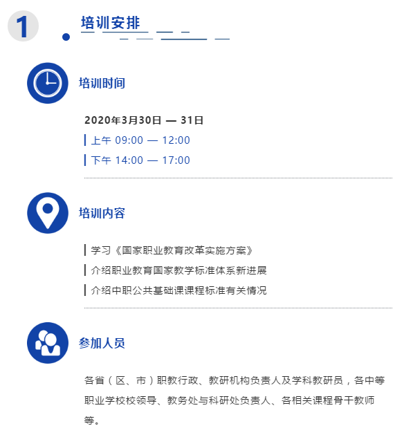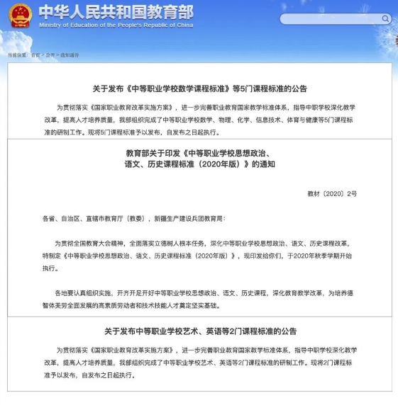 近期,教育部陸續頒布了中等職業(yè)學(xué)校思想政治、語(yǔ)文、歷史、數學(xué)、英語(yǔ)、信息技術(shù)、體育與健康、物理、化學(xué)、藝術(shù)10門(mén)公共基礎課的課程標準。為貫徹落實(shí)《國家職業(yè)教育改革實(shí)施方案》《關(guān)于加強和改進(jìn)新形勢下大中小學(xué)教材建設的意見(jiàn)》,落實(shí)立德樹(shù)人根本任務(wù),深化中等職業(yè)學(xué)?!敖處?、教材、教法”改革,幫助廣大學(xué)校和教師更好地領(lǐng)會(huì )并掌握各科課程標準,決定開(kāi)展中等職業(yè)學(xué)校10門(mén)公共基礎課課程標準培訓。