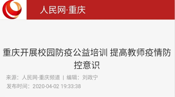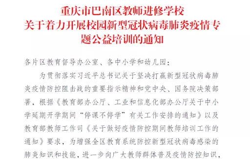 為進(jìn)一步向廣大教師群體普及疫情防控知識,提高防范意識,掌握疫情防控技能,重慶市中小學(xué)教師發(fā)展中心攜手高教社教師發(fā)展中心,面向重慶市廣大中小學(xué)幼兒園教職工開(kāi)展校園防控新型冠狀病毒肺炎疫情專(zhuān)題公益培訓。