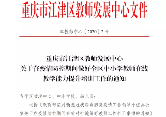 江津區教師發(fā)展中心下發(fā)《關(guān)于在疫情防控期間做好全區中小學(xué)教師在線(xiàn)教學(xué)能力提升培訓工作的通知(津教師中心〔2020〕2號)》,強調各單位要充分利用“國培計劃”學(xué)習平臺,積極引導、鼓勵教師充分利用網(wǎng)絡(luò )平臺免費開(kāi)放共享的優(yōu)質(zhì)教師培訓課程,自主選學(xué),開(kāi)展線(xiàn)上自主研修。區內63所學(xué)校1069名教師參與到了此次培訓中。