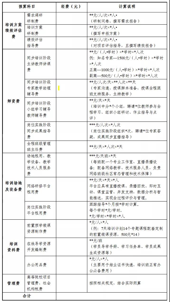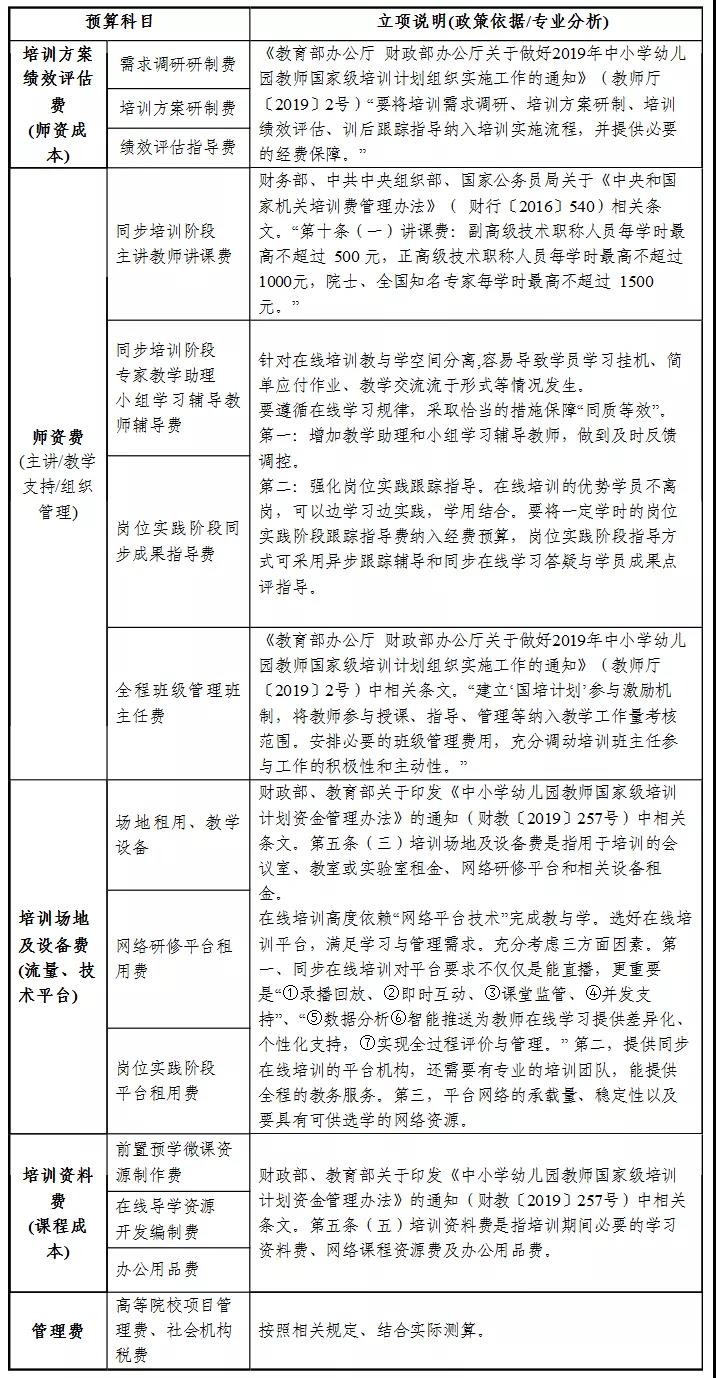各省要依據教育部教師工作司、財務(wù)司關(guān)于印發(fā)《中小學(xué)幼兒園教師在線(xiàn)培訓實(shí)施指南》的通知要求“經(jīng)費成本包括師資成本、課程使用成本、流量成本、技術(shù)平臺成本、學(xué)習支持成本、組織管理成本、管理費(稅費)成本等”。